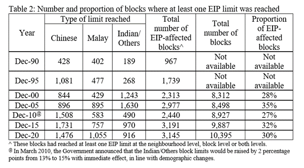 In view of the large number of HDB blocks and neighbourhoods, and the long time period involved, we have provided aggregated statistics at five-yearly intervals for the number of HDB neighbourhoods and blocks affected by the EIP limits. Please see Tables 1 and 2 for details.