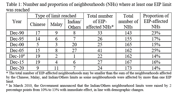 The second question is a question for information. In 1989, when EIP was introduced, 28% of the neighbourhoods had already reached the established EIP guidelines on the start date of the EIP. Over the years, this has fallen but there is no real clarity about why this has fallen. I am specifically referring to the number of new neighbourhoods that have also come about. So, the percentage can be very difficult to understand. For example, in Kaki Bukit and Aljunied GRC, the neighbourhood level numbers for the Malay community are still, I believe, beyond the EIP limits. And there is nothing untoward about race relations in Kaki Bukit. And I think this will be replicated in other parts of Singapore.