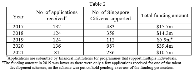 Over the past five years, FSDF has supported almost 600 applications from FIs, amounting to S$86 million under the various talent development schemes. This has benefitted close to 2,200 Singapore Citizens. The annual statistics relating to these schemes are provided in the table below. On average, almost all applications received were approved, save for the Financial Specialist Scholarship where the approval rate is about 50%2.