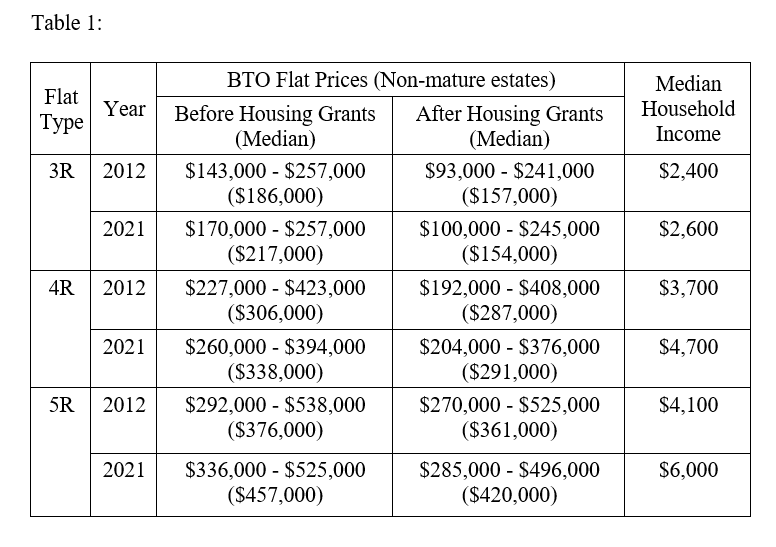 The prices of 3-room to 5-room BTO flats in the non-mature estates bought by first-timer Singaporean families in 2012 and 2021, and their median household incomes, are tabulated below.