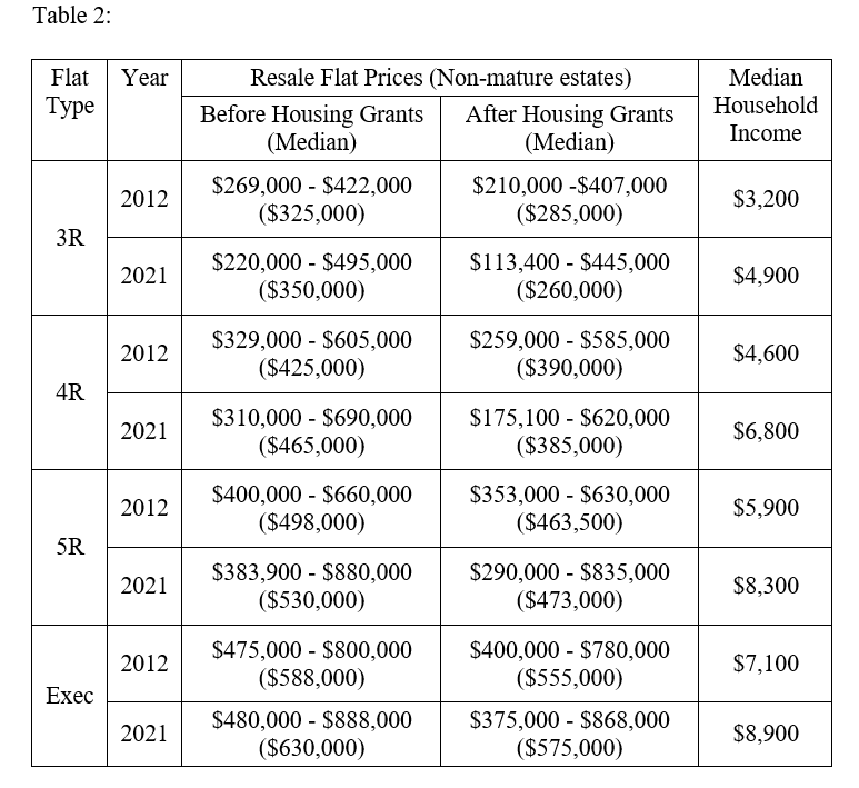 The prices of resale HDB flats in the non-mature estates bought by first-timer Singaporean families in 2012 and 2021, and their median household incomes, are tabulated below.