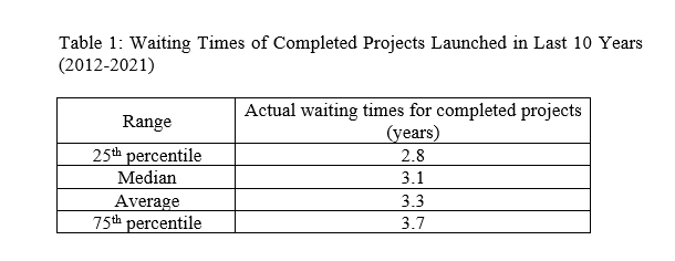 For HDB BTO projects launched in the last 10 years (2012 to 2021), the 25th percentile, median, average and 75th percentile of actual waiting times for completed projects are shown in Table 1 below.