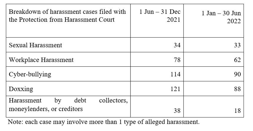 Mr K Shanmugam: Statistics on the breakdown of harassment cases filed with the Protection from Harassment Court from 1 June 2021 to 30 June 2022, is as follows: