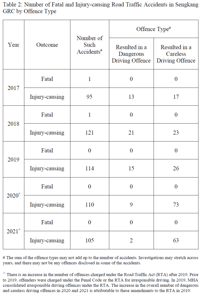 Mr K Shanmugam: Tables 1 and 2 show the number of road traffic accidents reported from 2017 to 2021 in Sengkang GRC, with the breakdown as requested by the Member.