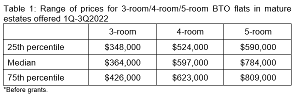 Mr Desmond Lee: The prices of BTO flats in mature estates offered in the first nine months of 2022 are tabulated in Table 1 below.