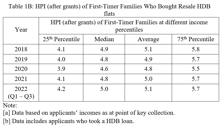 Mr Desmond Lee: The (i) number of first-timer families who bought a resale HDB flat, (ii) household incomes and (iii) house price-to-income (HPI) ratio for these families, from 2018 to 2022, are in Tables 1A and 1B.