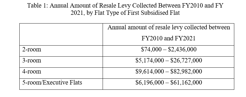 The breakdown of the range of resale levy collected from second-timers (STs) buying a new flat between FY2010 and FY2021, based on the flat type of their first subsidised flat, is in Table 1 below.