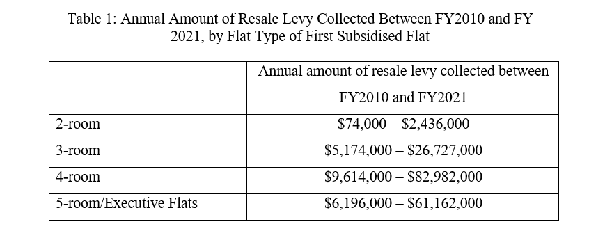 The breakdown of the range of resale levy collected from second-timers (STs) buying a new flat between FY2010 and FY2021, based on the flat type of their first subsidised flat, is in Table 1 below.