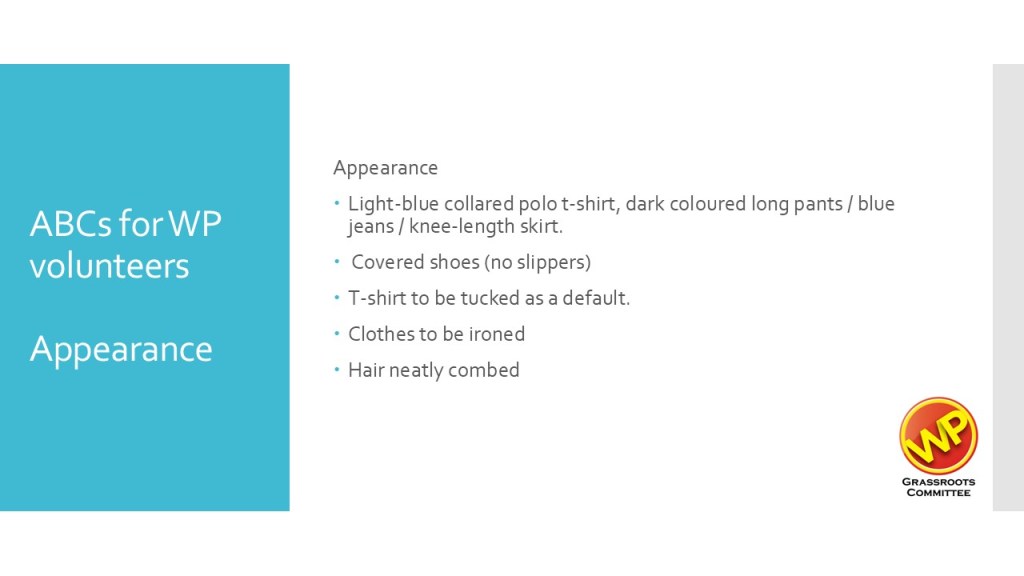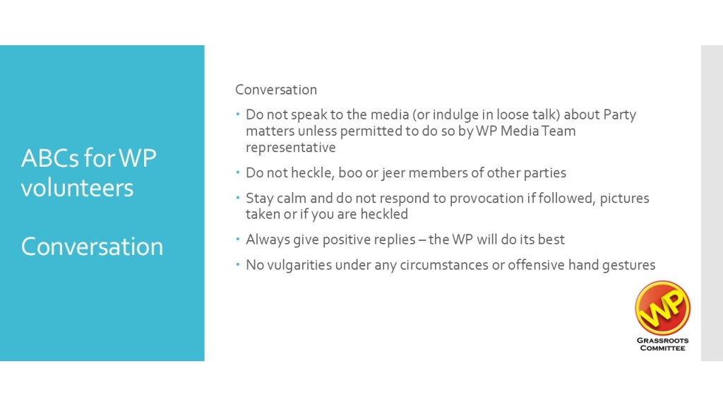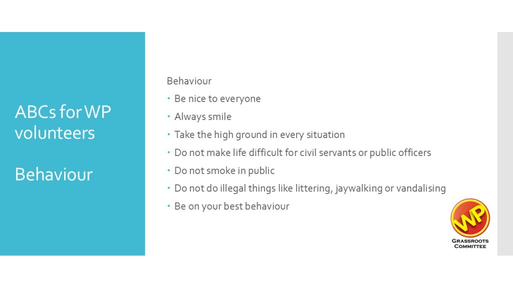 And equally important, after you raise the manpower, you have to look after your volunteers and remind them to work in the interests of the Party. They have to be briefed on what is expected of them – of the Party’s values and discipline.